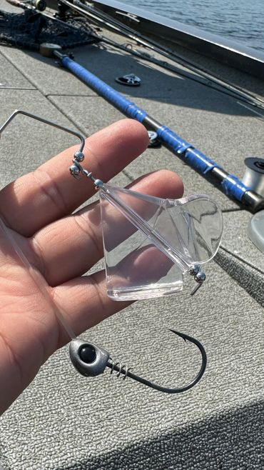 A metal blade to the darker water and cloudy days. Or to skip under docks and over hanging trees. The clear blade is highly pressured areas and clear water fisheries. The metal blades will squeal and the clear blades makes bubbles.